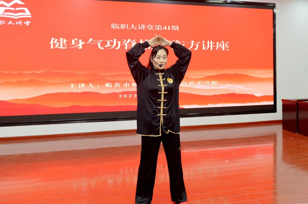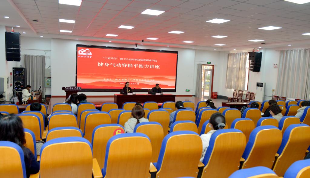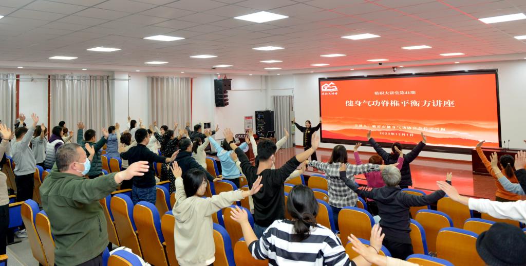 为深入贯彻落实全民健身国家战略,营造健康工作氛围,增强教职工体质,锻造一支身心健康、精力充沛、能适应学校高质量发展的教职工队伍,推进健康校园建设,12月1日,我校举办第四十一期临职健康大讲堂—健身气功脊椎平衡方讲座。邀请临沂市健身气功协会会长王雪梅主讲,学校党委委员、工会主席、党委办公室(院长办公室)主任王茂坤主持讲座。