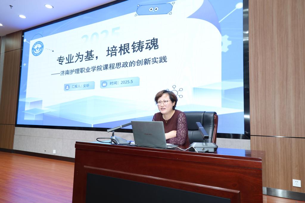 在校际交流研讨环节,山东水利职业学院刘青果、东营职业学院李永莲、济南护理职业学院安昕、济南电子机械学校赵玉锋、临沂职业学院隋燕玲,分别以《三平台、三维度、三课堂推进课程思政建设的山水实践》《系统化设计一体化推进:构建思政课程、课程思政与专业思政协同育人新格局》《专业为基,培根铸魂——济南护理职业学院课程思政的创新实践》《打造六位一体的思政教育体系助力育人质量提升》《引领·协同·创新 同向同行共绘育人同心圆》为题进行交流研讨,展示了各职业院校在思政课程与课程思政方面进行的探索和取得的显著成效。
