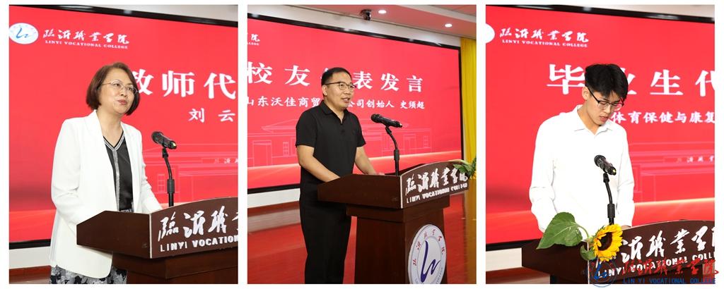 教师代表刘云教授饱含深情回顾了三年里与学生朝夕相处的学习生活点滴,勉励同学们做终身学习的践行者、脚踏实地的奋斗者、德技双馨的传承者,深情嘱咐他们用科学的方式健康生活、愉快工作。2011届校友、山东沃佳商贸有限公司负责人史须超以自身在校学习和毕业创业历程做了深情分享,表示母校赋予的,远不止毕业证书上的专业名称,而是面对未知的沉着心态,拆解复杂问题的思维路径和终身学习的自觉能力。希望广大学弟学妹拥抱未知、守护热爱、锻造韧性、铭记感恩。毕业生代表韩连轩回顾在校时光并承诺未来将以精业、暖心、创新回报母校与社会。