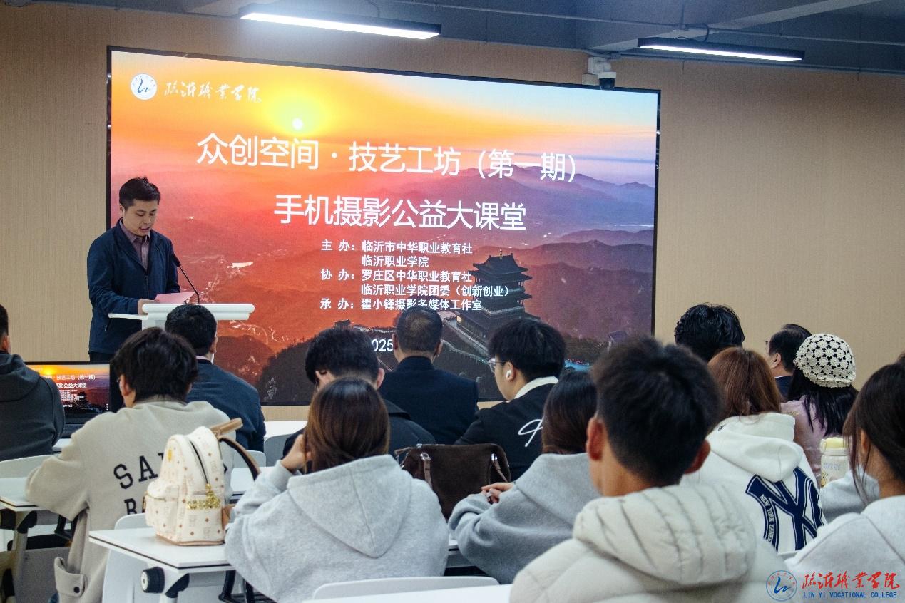 10月31日,学校“众创空间·技艺工坊”首期手机摄影公益大课堂,在罗庄校区众创空间报告厅举行。临沂市中华职教社副主任相振生,临沂职业学院党委副书记、临沂市中华职教社副主任姚兴建出席活动。