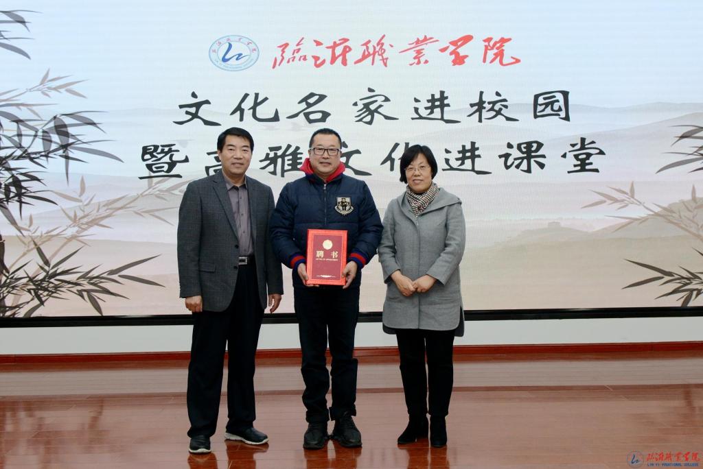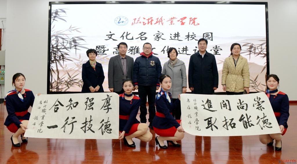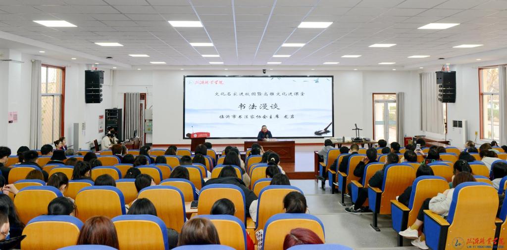 为继承和弘扬中华优秀传统文化,进一步完善学校美育体系,营造“以文化人,以美育人”的良好氛围,11月23日,我校在美术馆开展了第一期“文化名家进校园暨高雅文化进课堂”活动。活动特邀临沂市书法家协会主席龙岩先生主讲,院党委成员、各部门负责人及全校师生代表200余人参加了活动。