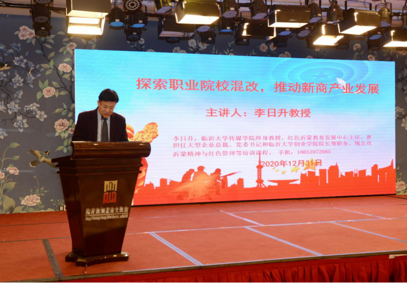 本次年会特邀山东商贸物流研究院执行院长李晓东教授、临沂大学传媒学院教授李日升博士、上海泓牛网络科技有限公司总经理赵国栋三位专家,分别以“临沂商贸物流转型升级路径探索”、“探索职业院校混改推动新商产业发展”、“科技改变物流”为题作了精彩报告。