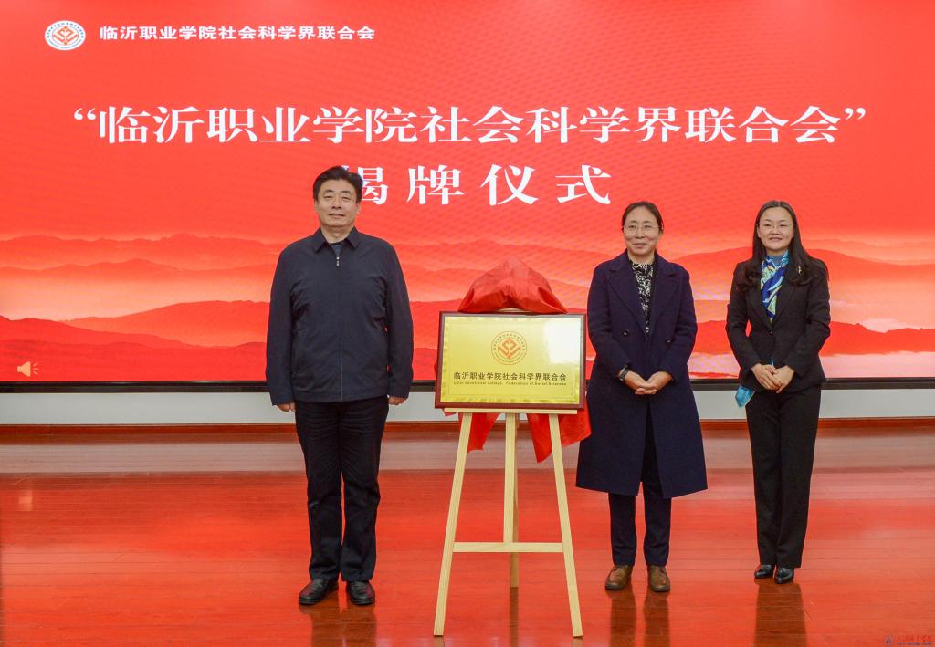 学校党委副书记、副院长杜常芹宣读《中共临沂职业学院委员会关于成立临沂职业学院社会科学界联合会的决定》,临沂市社会科学界联合会党组成员、副主席杨金童宣读《关于同意临沂职业学院社会科学界联合会为临沂市社会科学界联合会团体会员的批复》,张伟红、段华、刘磊为“临沂职业学院社会科学界联合会”揭牌。
