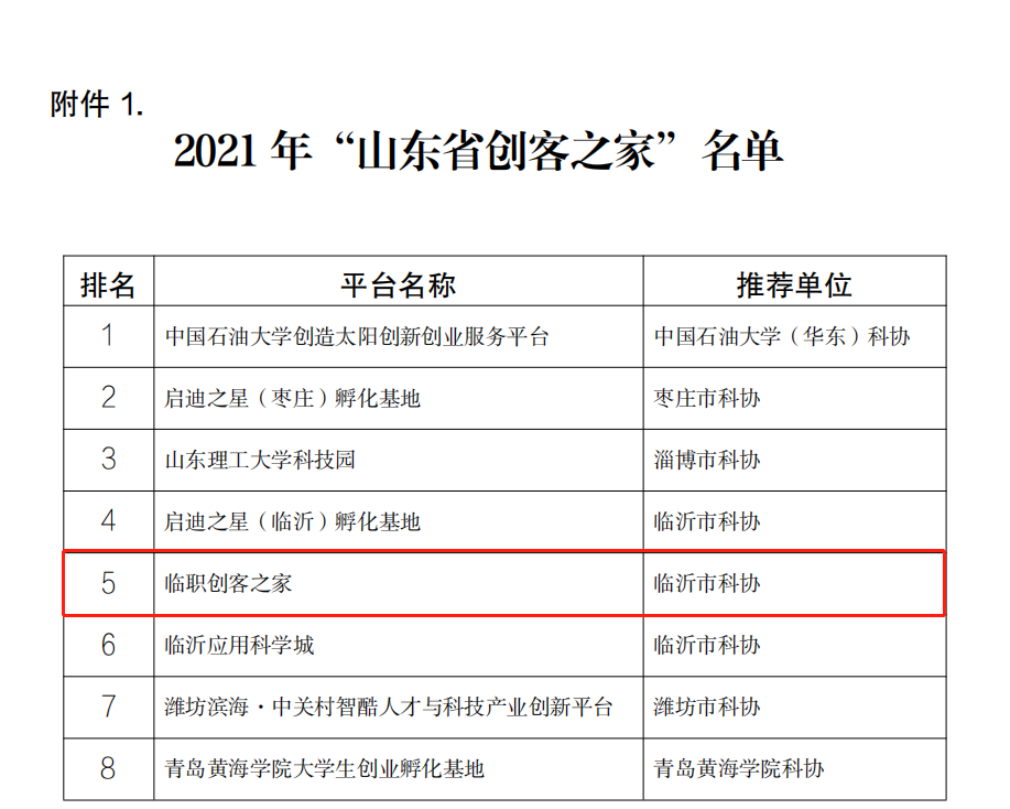 2021年12月,我校获评“山东省创客之家”称号。该荣誉由临沂市科学技术协会推荐、山东省科学技术协会评审认定,2021年全省仅有8家单位获此殊荣。这是我校继2018年获得“临沂市创客之家”“山东省众创空间”、2021年获得“山东省品牌众创空间”之后获得的又一省级荣誉。