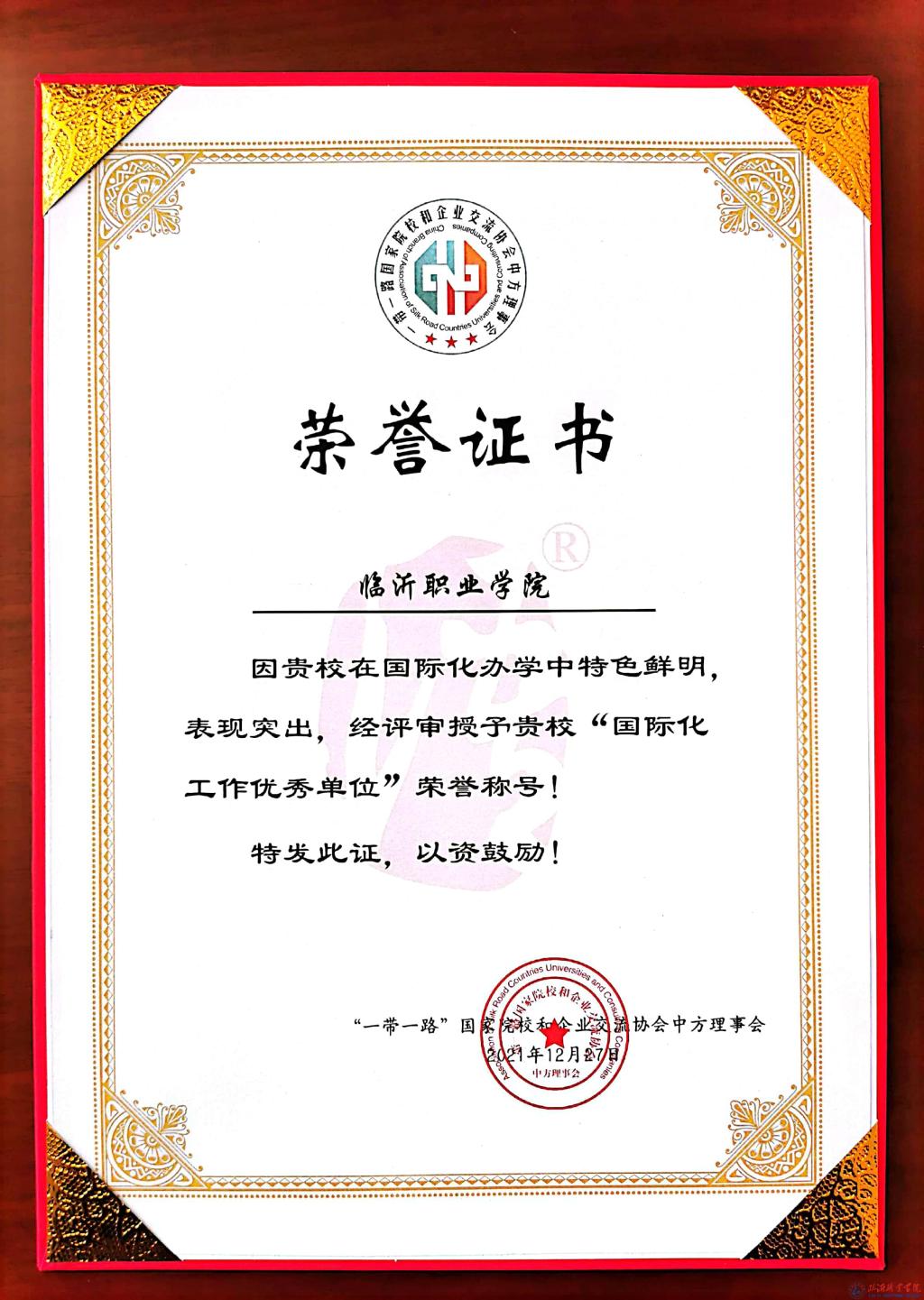 近期,经评审,因我校在国际化办学中特色鲜明,表现突出,获“一带一路”国家院校和企业交流协会中方理事会颁发的“国际化工作优秀单位”荣誉称号。
