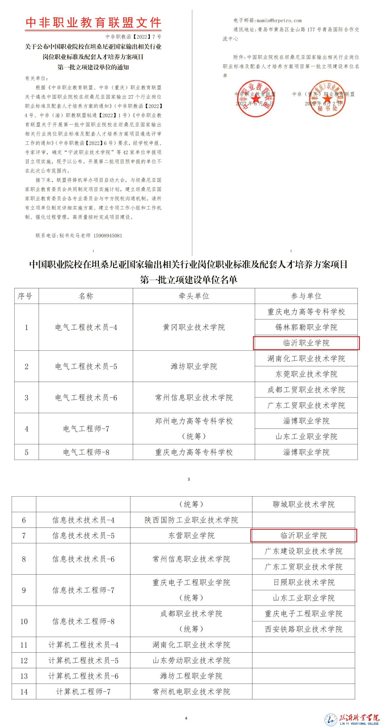 根据《中非职业教育联盟、中非(重庆)职业教育联盟关于遴选中国职业院校在坦桑尼亚国家输出27个行业岗位职业标准及配套人才培养方案的通知》和《中非职业教育联盟关于开展第一批中国职业院校在坦桑尼亚国家输出相关行业岗位职业标准及配套人才培养方案项目遴选评审工作的通知》要求,经学校申报并答辩,专家评审,我校申报的“电气工程技术员”和“信息技术技术员”项目获批立项。