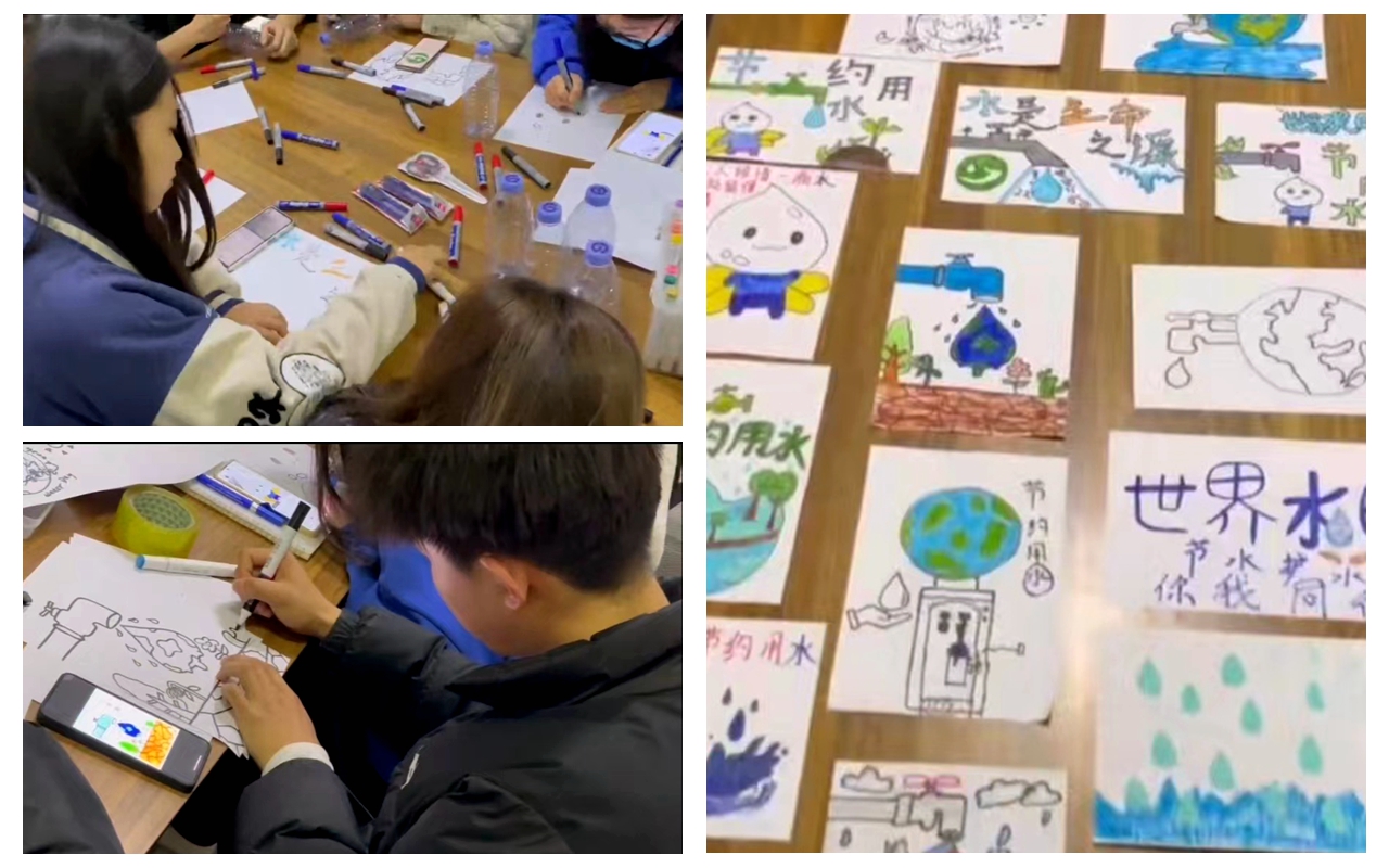 3月21日,参与活动的学生在青年之家开展了“清瓶行动”手工DIY制作和节水海报绘画。同学们在空水瓶上进行节水创意手绘,将喝完的水瓶变“废”为宝,制作成了环保又实用的收纳瓶,同时绘制了主题鲜明、生动活泼的宣传海报,为“世界水日”节水宣传活动做了充分的准备和预热。