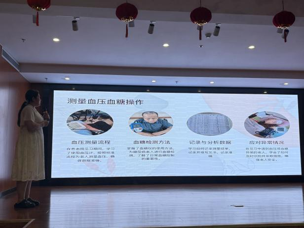 乐亲学院第五批见习学生得到临沂市老年养护院各级领导及带教老师的一致好评,5名见习学生代表结合自身实际和思想认识,通过PPT展示的方式分享了实践期间个人感悟与收获。