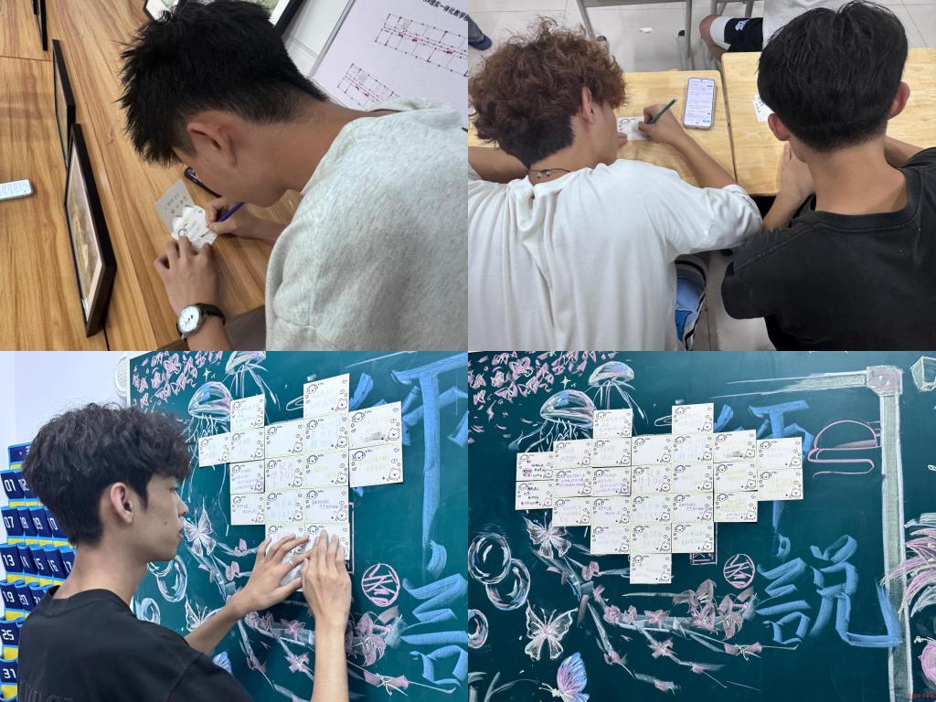 “贺卡寄情”环节则让同学们借助笔尖传递祝福。大家认真书写心声,并将一张张写满寄语的贴纸拼贴成巨大的“祝福爱心”。每张便利贴都凝聚着学子对老师的深厚情谊,拼合出创意与温度兼具的集体致谢。