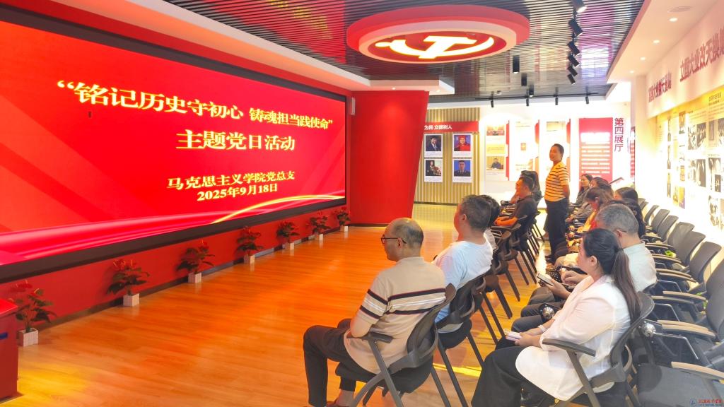 为深刻铭记历史、传承红色基因,进一步强化党员党性修养与使命担当,9月18日,马克思主义学院党总支以“九·一八”事变94周年纪念日为契机,开展“铭记历史守初心・铸魂担当践使命”主题党日活动。此次活动,通过回顾历史,激励和引导全体党员大力弘扬以爱国主义为核心的民族精神,铭记历史、缅怀先烈、珍爱和平、热爱祖国。