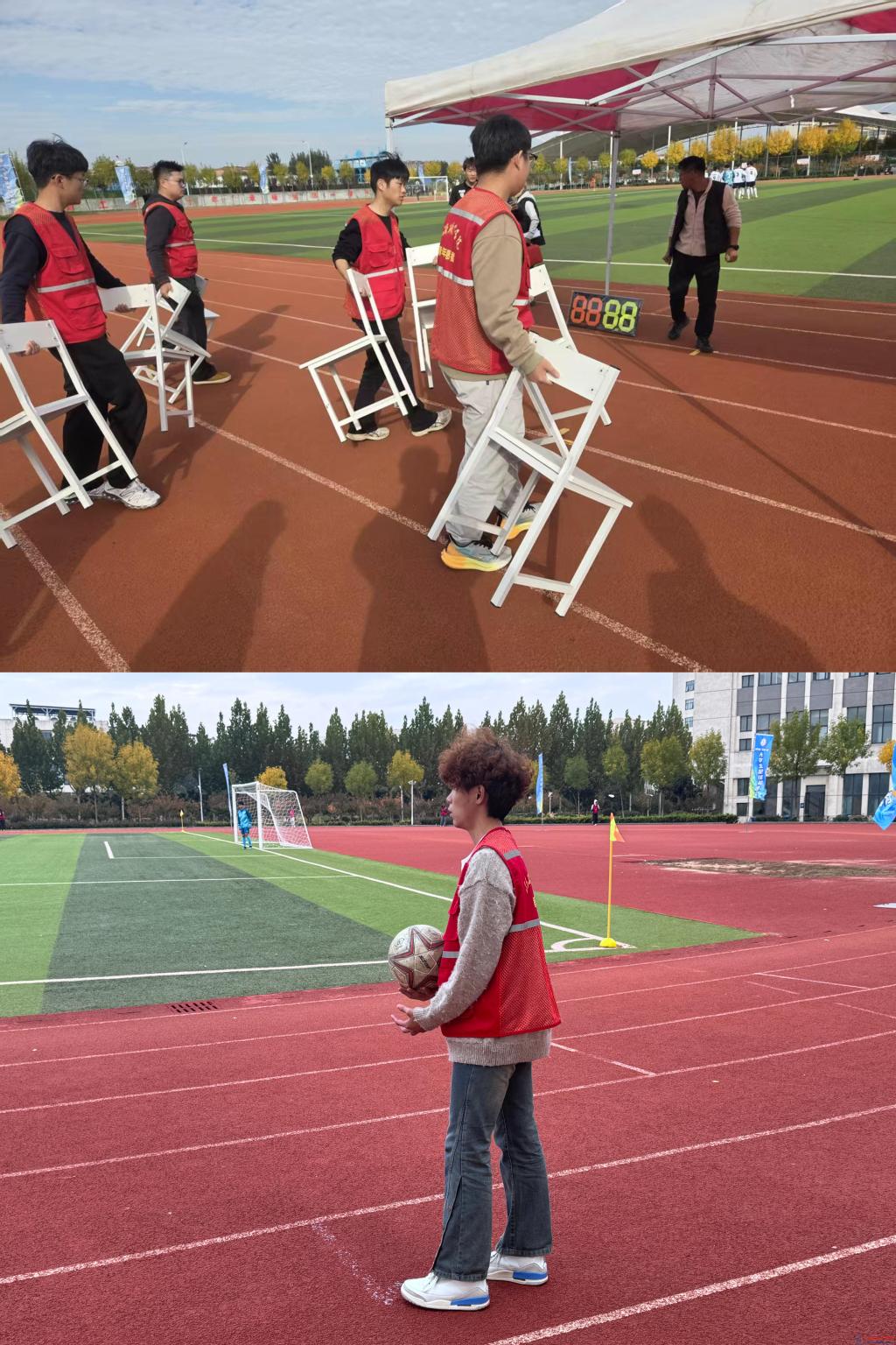 活动当天,志愿者们身着统一红色马甲,提前抵达操场,以饱满的精神状态投入到各项准备工作中。大家分工明确、配合默契,围绕场地布置、物资整理与安全排查等重点内容展开服务。在绿茵场上,志愿者们高效完成各项任务,跃动的红色身影成为赛场边一道亮眼的风景线。