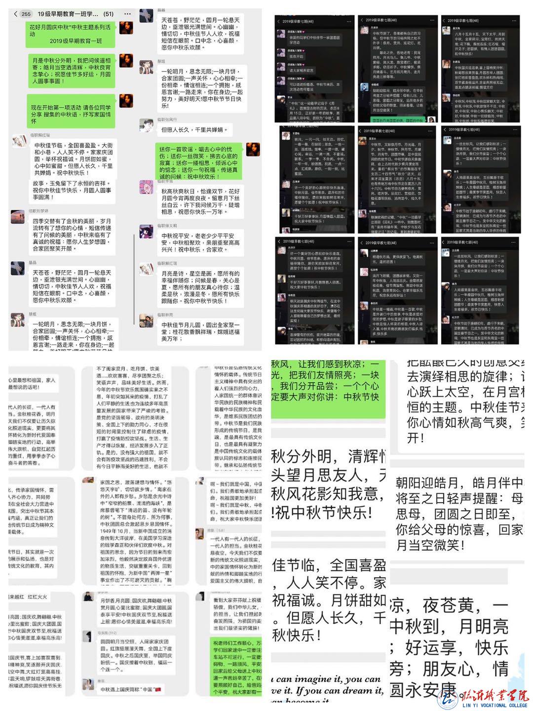 活动一:“中秋佳节—一家团圆”。9月30日,组织师生通过微信群开展“中秋佳节,一家团圆”线上团学活动。师生在线上共同赏析古今中秋诗词,分小组讨论了中秋节的风俗习惯、传说和故事,同学们积极发送关于中秋活动的文字、图片及感言寄语,一同分享欢度传统节日的喜悦;另外,此次团学活动还一起歌颂了疫情防控期间的“逆行者”和“守护者”,向疫情期间所有工作人员致敬,为他们书写“中秋”寄语,抒发家国情怀。