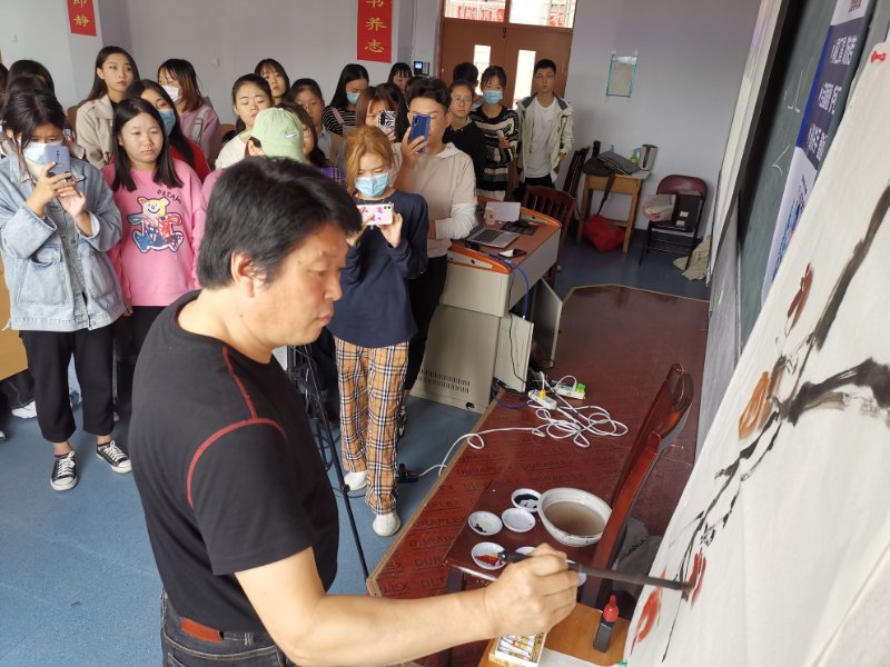 讲座中,清石老师先后介绍了中国大写意花鸟画的发展历程以及当前发展状态,并就中国传统文化对时代发展的影响进行了重点讲解。最后,清石老师现场作画,大写意作品气势磅礴,水墨淋漓,带给了同学们一场精彩的视觉盛宴。