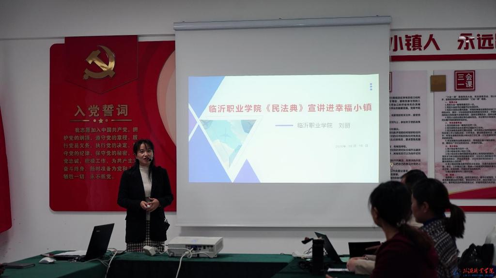 10月16日上午,思政部党总支书记王金义一行五人到罗庄区“幸福小镇”为社区居民开讲《民法典》和《心理健康教育》课程。