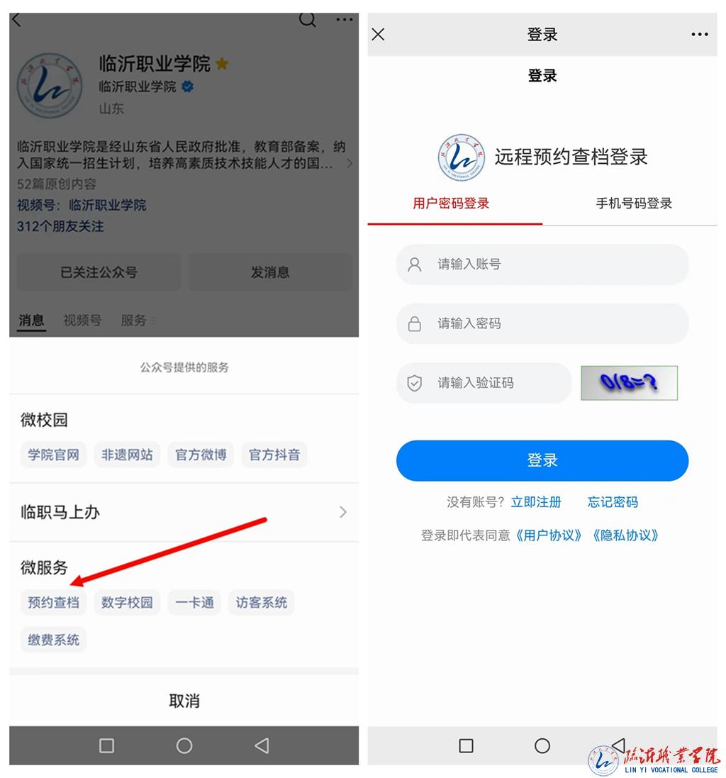 手机端:关注“临沂职业学院”公众号,打开“微服务”栏目,点击“预约查档”,登录远程预约查询系统办理业务。