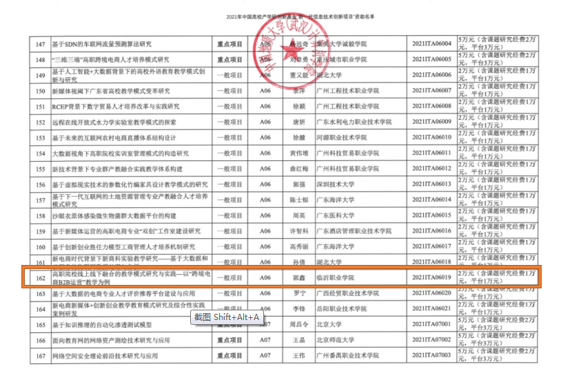 近日,教育部科技发展中心2021年新一代信息技术创新项目课题立项名单公布,商贸物流学院郭鑫老师主持申报的《高职院校线上线下融合的教学模式研究与实践—--以“跨境电商B2B运营”教学为例》获批立项。