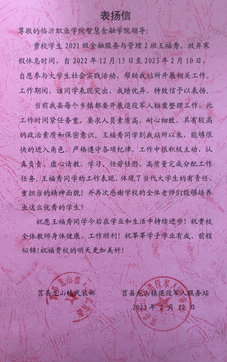 2月12日,莒县龙山镇武装部、莒县龙山镇退役军人服务站共同向我校发来了表扬信,对智慧金融学院2021级金融服务与管理专业2班的王福秀同学在大学生社会实践活动中的付出和贡献进行表扬,对我校长期以来立德树人、润物无声的教育表示感谢。