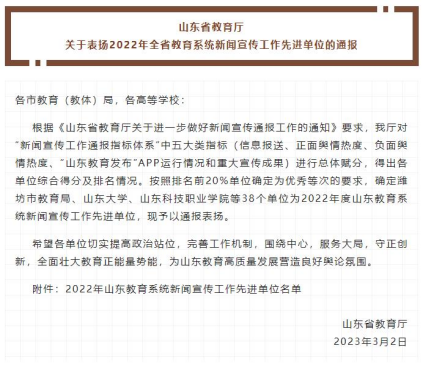近日,山东省教育厅印发《关于表扬2022年全省教育系统新闻宣传工作先进单位的通报》,我校获评“2022年度山东教育系统新闻宣传工作先进单位”。