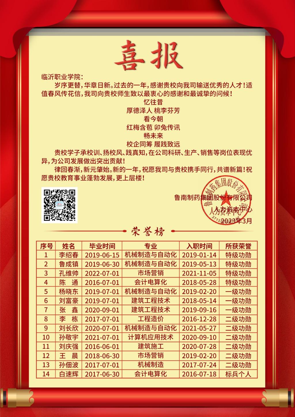 鲁南制药集团是集中药、化学药品、生物制品的生产、科研、销售于一体的综合制药集团,位列中国大企业集团竞争力500强。此次喜报的获得,是鲁南制药集团对我校毕业生的高度评价和认可,也是对学校人才培养工作的肯定,充分印证了校企双主体育人实效,展示了校企双方合作的深厚底蕴,也为校企双方进一步深化合作奠定了坚实的基础。