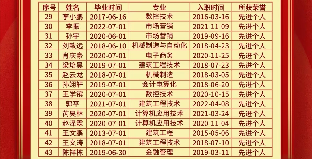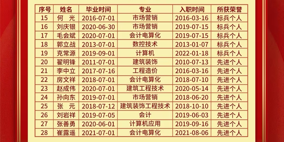 毕业生来自商贸物流学院、现代建筑学院、智慧金融学院、信息工程学院、智能制造学院等5个二级学院,分别获得鲁南制药集团“特级功勋”(4人)、“一级功勋”(3人)、“二级功勋”(6人)、“标兵个人”(6人)、“先进个人”(24人)等荣誉称号。