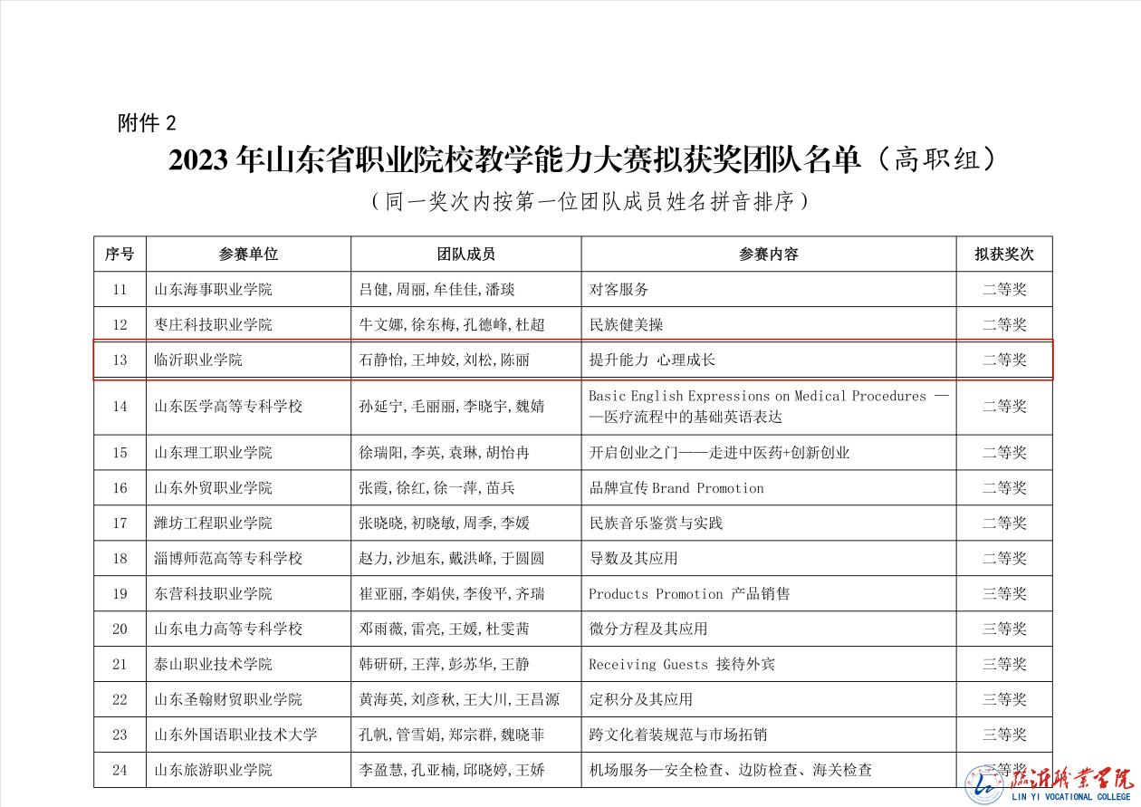 近日,山东省教育厅公示2023年山东省职业院校教学能力大赛获奖名单,我校马克思主义学院的参赛作品《提升能力 心理成长》荣获公共基础课程组二等奖。