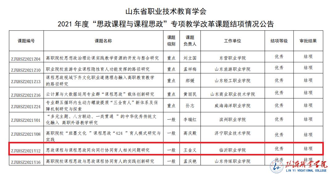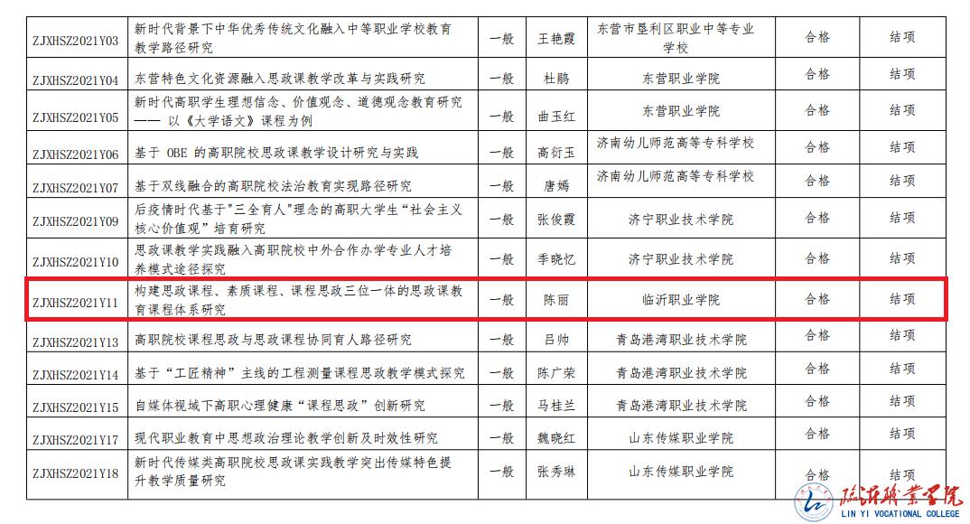 近日,山东省职业技术教育学会公布了2021年度“思政课程与课程思政”专项教学改革课题结项评审结果,我校马克思主义学院教师王金义主持的《思政课程与课程思政同向同行协同育人相关问题研究》、陈丽主持的《构建思政课程、素质课程、课程思政三位一体的思政课教育课程体系研究》两项课题通过专家评审验收,圆满结题。