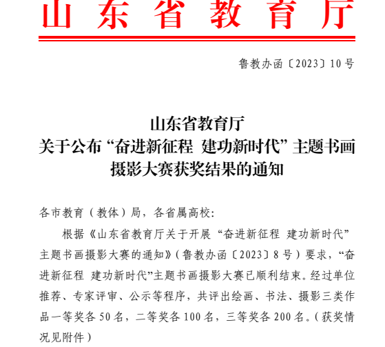 近日,由山东省教育厅举办的2023年“奋进新征程 建功新时代”主题书画摄影大赛评审结果公布。我校教师的作品《参观红色基地 追寻革命精神》荣获摄影类作品三等奖。