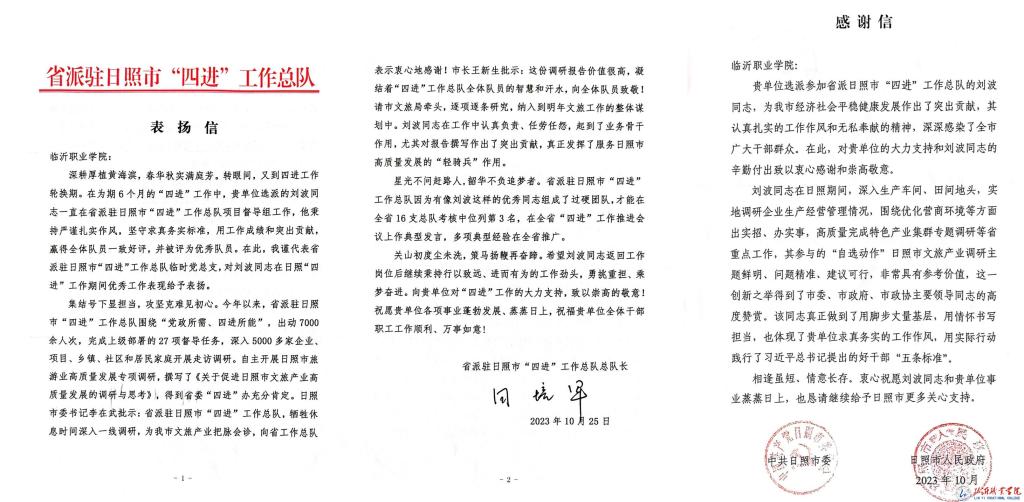 近日,日照市委市政府、山东省派驻日照市“四进”工作总队给我校发来感谢信和表扬信,对学校关心支持日照市经济社会平稳健康发展表示感谢,对派出教师刘波在日照“四进”工作期间的优秀工作表现给予表扬。