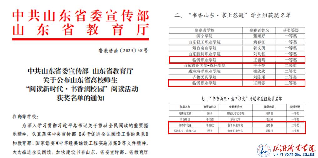 近日,山东省教育厅公布了“山东省高校师生‘阅读新时代·书香润校园’阅读活动”获奖名单,学前教育学院王澍晴获“书香山东·掌上答题”学生组一等奖,学校师生共获奖项16项,学校荣获集体优秀奖。