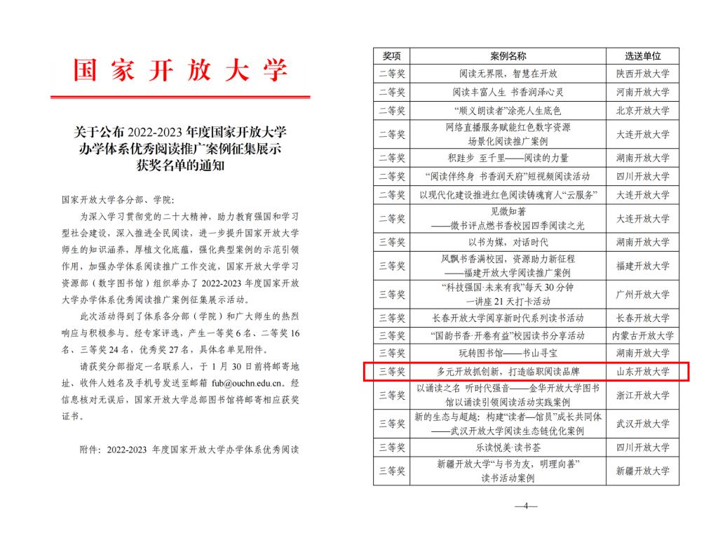 近日,国家开放大学公布了2022-2023年度国家开放大学办学体系优秀阅读推广案例征集展示活动评选结果。我校图书信息中心报送的《多元开放抓创新,打造临职阅读品牌》案例荣获三等奖,是山东省唯一获奖的阅读推广案例。