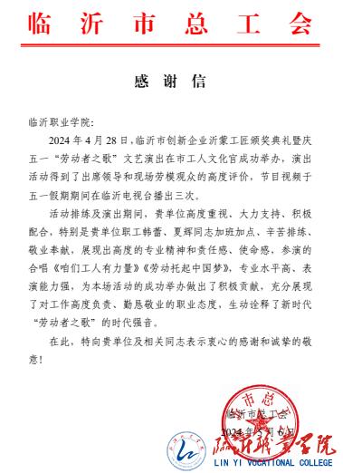 近日,学校收到临沂市总工会感谢信,对学校韩蕾、夏辉两位老师在临沂市创新企业沂蒙工匠颁奖典礼暨庆五一“劳动者之歌”文艺演出活动排练及演出期间的表现表示肯定,感谢这两位老师对文艺演出成功举办做出的贡献。