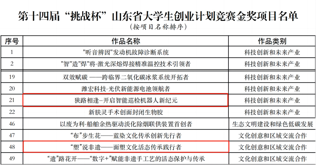 6月6日,第十四届“挑战杯”山东省大学生创业计划竞赛终审决赛在烟台大学圆满闭幕。我校共推荐5个项目参加省赛复赛,其中《狭路相逢--开启智能巡检机器人新纪元》《“塑”说非遗——面塑文化活态传承践行者》两个项目进入决赛,经过激烈的角逐和团队出色发挥,最终全部荣获金奖,另外2个项目获得铜奖,取得“挑战杯”历史最好成绩。