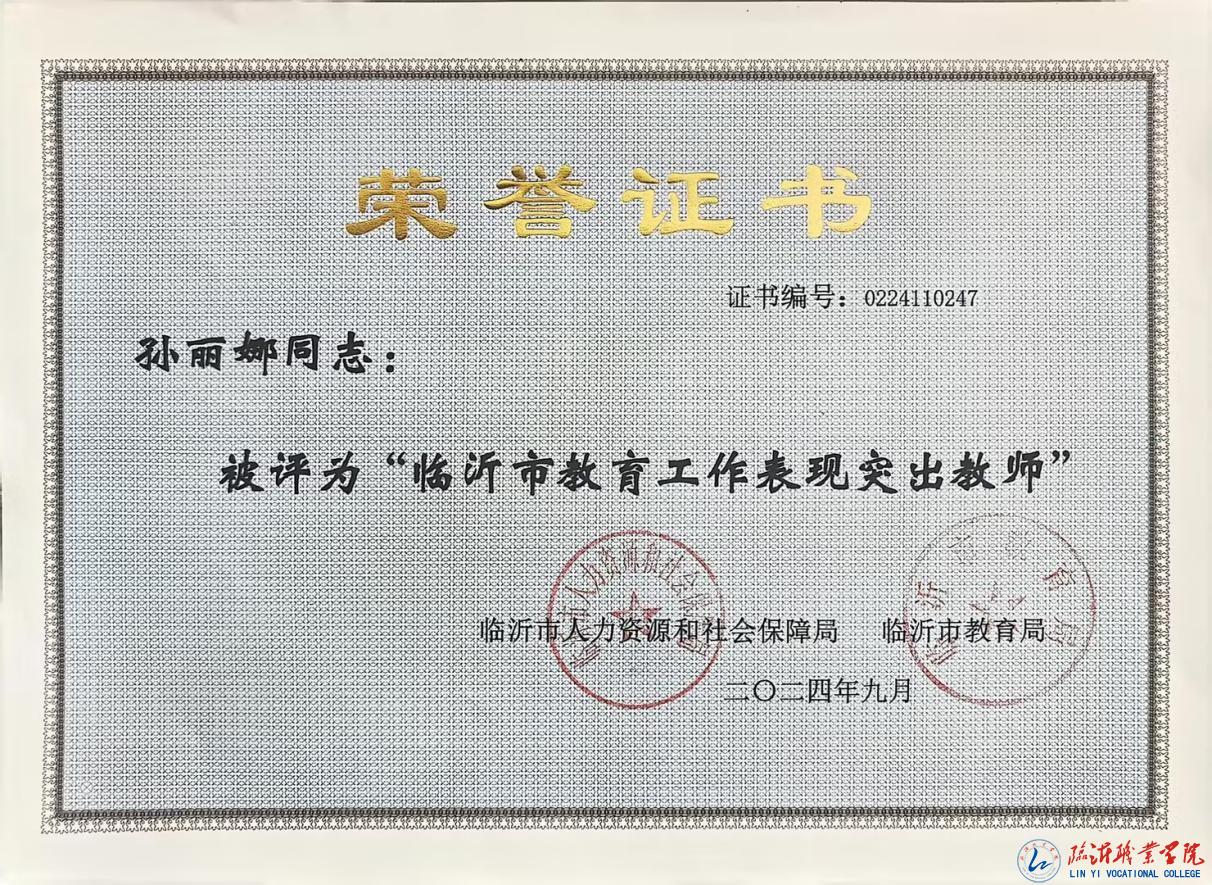 近日,临沂市人力资源和社会保障局、临沂市教育局联合发布通报,我校信息工程学院孙丽娜老师荣获“临沂市教育工作表现突出教师” 称号。