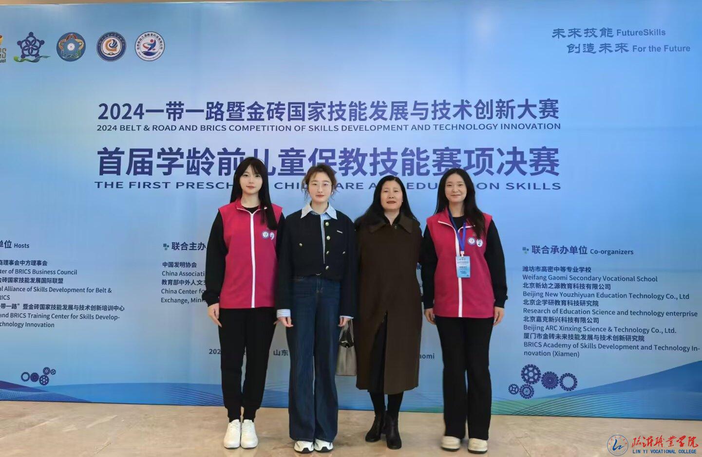 近日,2024一带一路暨金砖国家技能发展与技术创新大赛首届学龄前儿童保教技能赛项全国总决赛在山东省高密举办。我校学前教育学院代表队王靖雯、单愉斐两名同学与来自全国各地的77个参赛队伍、一百多名选手同台竞技,凭借扎实的专业知识和专业技能,荣获银奖;韩其丽、魏晓冉两位教师荣获优秀指导教师奖;我校被授予优秀组织奖。