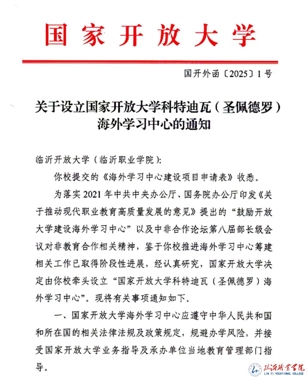 近日,国家开放大学正式批复临沂职业学院(临沂开放大学)设立国家开放大学科特迪瓦(圣佩德罗)海外学习中心。这是学校落实中共中央办公厅、国务院办公厅《关于推动现代职业教育高质量发展的意见》中关于“建设海外学习中心”部署要求,服务国家“一带一路”倡议,推动职业教育国际化发展的又一重大进展。