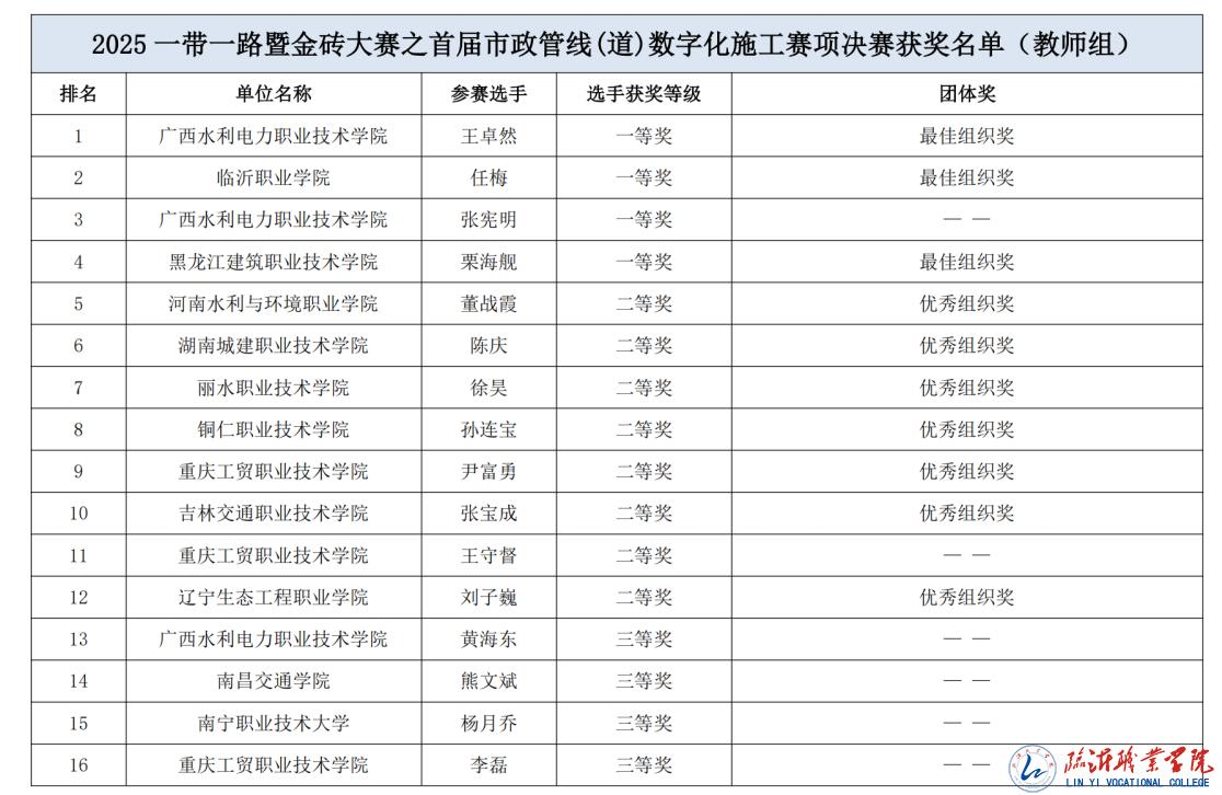6月20日-22日,2025“一带一路”暨金砖国家技能发展与技术创新大赛之首届市政管线(道)数字化施工赛项总决赛在广西水利电力职业技术学院举办,我院教师任梅凭借出色表现,斩获该赛项教师组一等奖。同时,我校获评“最佳组织奖”。