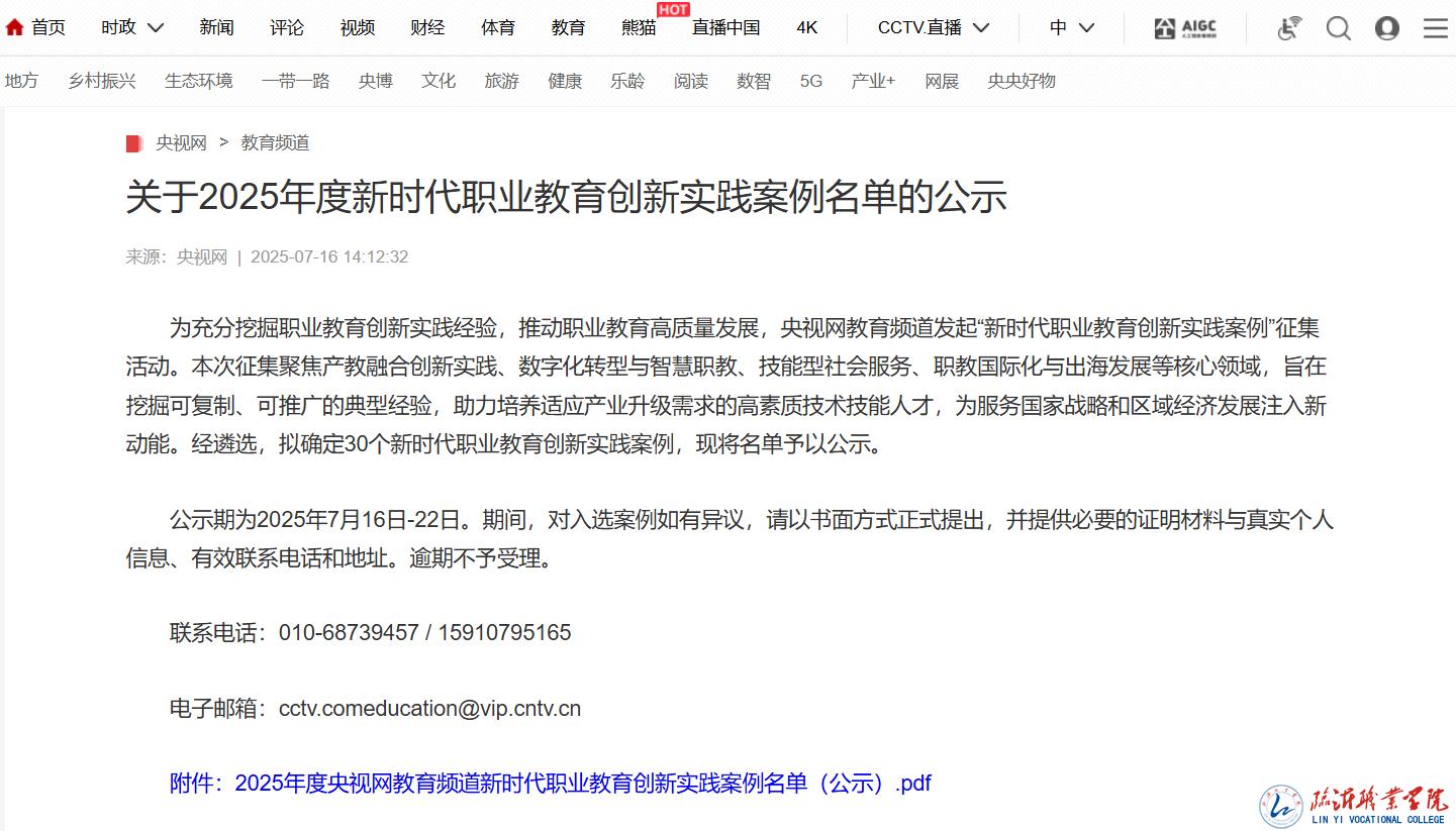 本次案例征集活动由央视网教育频道主办,聚焦产教融合创新实践、数字化转型与智慧职教、技能型社会服务、职教国际化与出海发展四大核心领域,旨在挖掘可复制、可推广的典型经验,助力培养适应产业升级需求的高技能人才。我校案例以“校企共建”为基础,通过“区域共享”机制打破资源壁垒,依托“虚实共生”技术重构实训场景,最终实现“人才共育”目标,充分契合国家产教融合政策导向。