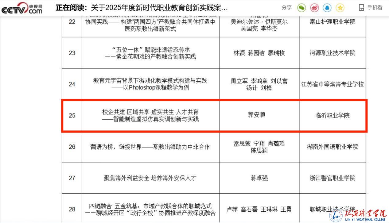 7月16日,央视网教育频道发起的“新时代职业教育创新实践案例”评选结果已公示,我校《校企共建·区域共享·虚实共生·人才共育——智能制造虚拟仿真实训创新与实践》案例脱颖而出,成功入选2025年度新时代职业教育创新实践优秀案例。该案例将于8月18-20日在北京召开的“2025全球智慧教育大会职业教育主题论坛”上公布,央视网及央视相关媒体将进行专题报道。
