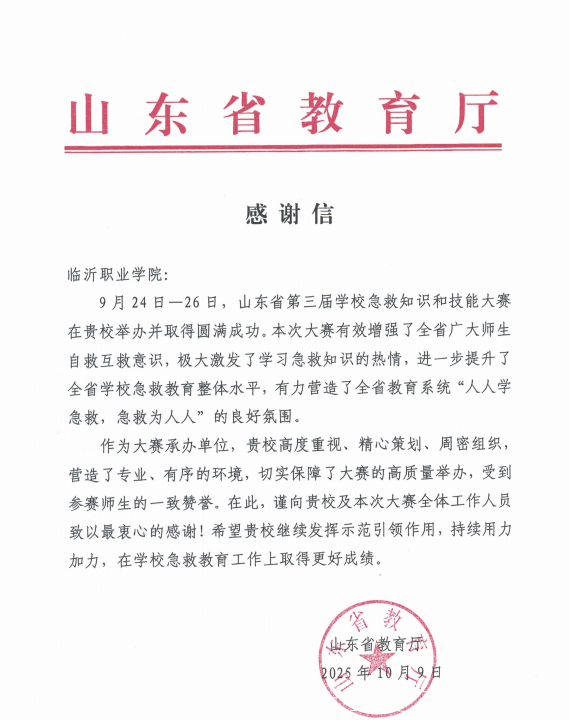 近日,山东省教育厅向我校发来感谢信,对我校成功承办“山东省第三届学校急救知识和技能大赛”表示高度肯定和衷心感谢。