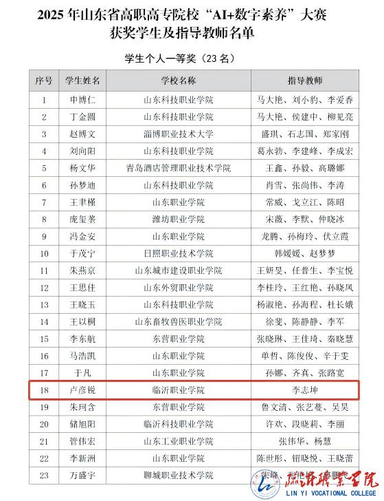 自大赛正式启动以来,学校成立领导小组和专业指导团队进行广泛动员、精心组织。各院系积极组织学生踊跃参加校赛,最终选拔出6名学生代表学校参加2025年山东省高职院校“AI+数字素养”大赛,与全省49所院校的200余名优秀选手同台竞技,获得省赛一等奖1名、二等奖2名、三等奖1名。