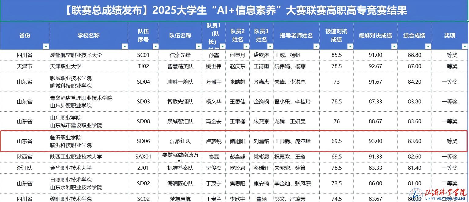 近日,2025年全国大学生(高职高专)“AI+信息素养”大赛联赛顺利落下帷幕。我校信息工程学院学生卢彦锐与临沂科技职业学院学生储旭阳、刘濡铭共同组建的“沂蒙红”队以全国并列第五名的综合成绩荣获一等奖,在“巅峰对决”答辩赛中成绩位列全国第一。