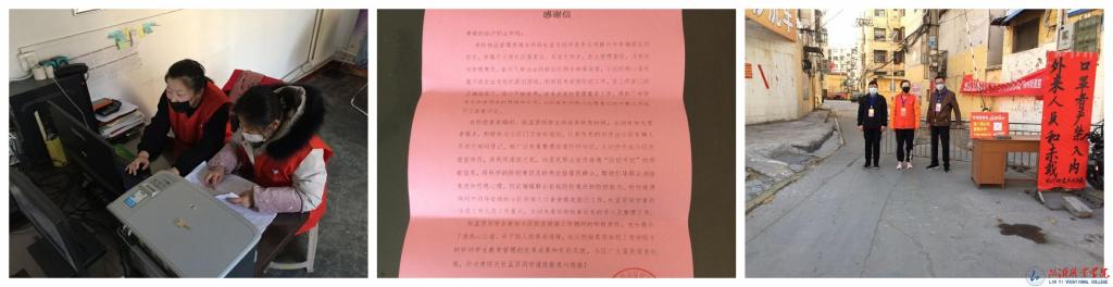 “我是退役军人,退伍不褪色,这个时候我必须顶上去!”2019级物流管理贯通本科班杜孟贤同学就是典型代表。在防控居家期间,杜孟贤同学主动放弃休息时间,参加志愿者服务。她积极参与小区门卫安检值班,认真负责的对进出小区车辆人员进行询问登记;她广泛收集整理疫情防控知识,主动担当小区防疫宣传员,并利用值班之机,向居民群众宣传疫情“防控可控”的积极信息,将科学的防控常识及时传达给居民群众;她主动协助开展小区住房人口普查摸底登记工作,认真核查、录入及整理住户信息,利用自己的计算机知识的优势,极大了推动了小区疫情防控工作。其所在社区居委会专门向学院寄来感谢信,对学院及杜孟贤同学表达了敬意与感谢!
