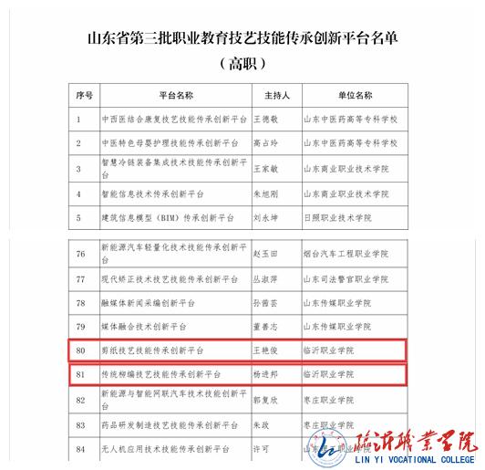 此次山东省第三批职业教育技艺技能传承创新平台申报通过了148个平台,其中高职97个,中职51个。我校申报的“剪纸技艺技能传承创新平台”、“传统柳编技艺技能传承创新平台”,依托优秀传统文化进校园暨非遗博览会、大师工作室建设、非遗选修课等载体,以促进优秀传统技艺技能传承为目标,以提升教师技艺技能传承创新能力为重点,旨在开展技艺传承、产品研发与技术创新、新技术技能的开发与应用、实习实训资源开发、创新创业教育和协同研修与创新。