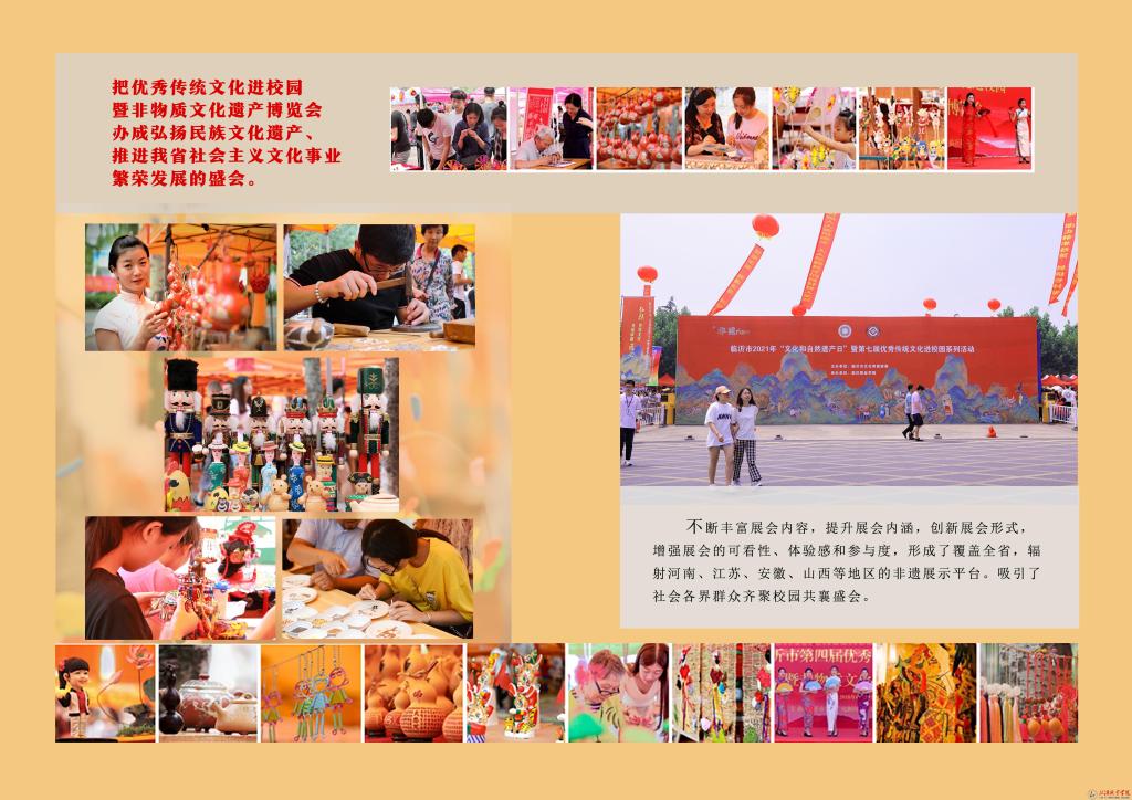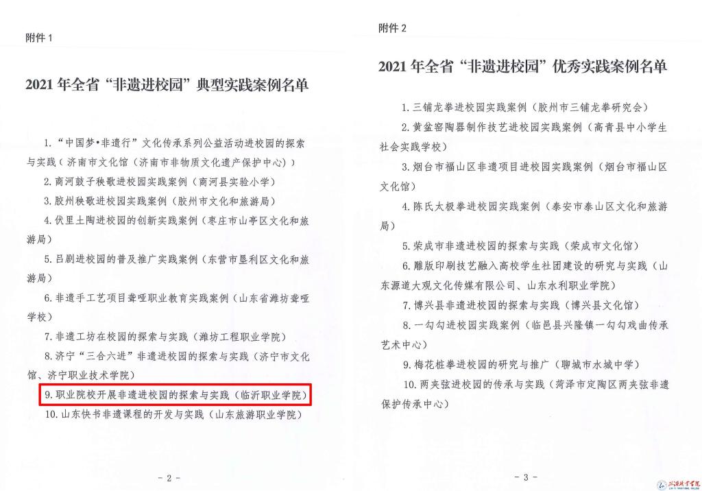 为推动非遗融入国民教育体系,促进非物质文化遗产与教育深度融合,山东省文化和旅游厅启动了2021年全省“非遗进校园”优秀实践案例评选工作,我校申报的案例《职业院校开展非遗进校园的探索与实践》成功入选2021年山东省“非遗进校园”典型实践案例。