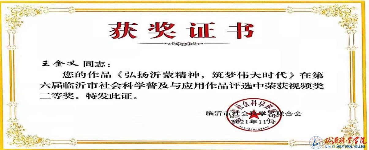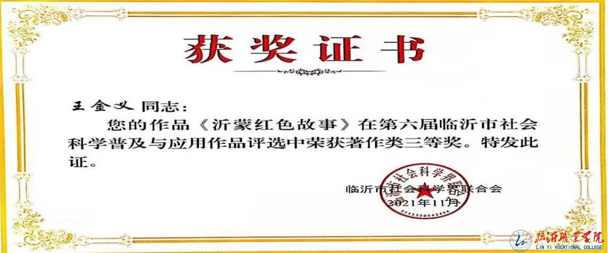 为进一步推动全市社会科学普及与应用作品的创作出版,不断提升人民群众思想觉悟、道德水准、文明素养和社会文明程度,促进文化强市建设,临沂市社会科学界联合会组织开展了第六届临沂市社会科学普及与应用优秀作品征集评选活动。经专家组评审,我校马克思主义学院院长王金义主持的两个项目全部获奖。其中,《弘扬沂蒙精神,筑梦伟大时代》荣获视频类二等奖,《沂蒙红色故事》荣获著作类三等奖。