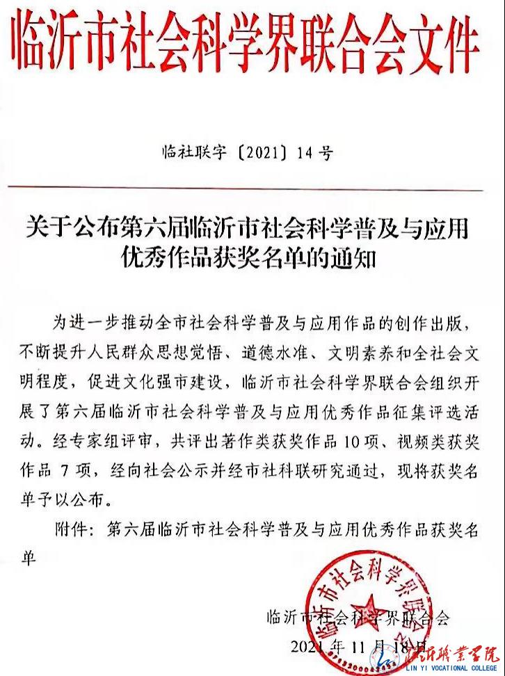 我校在第六届临沂市社会科学普及与应用作品评选中荣获两个奖项