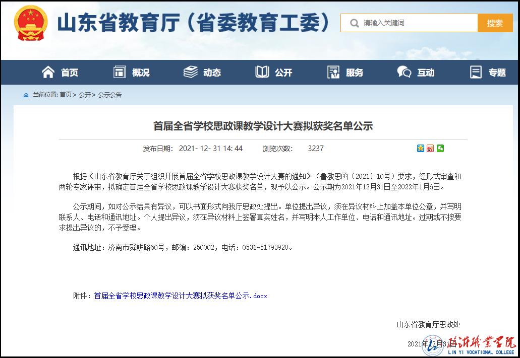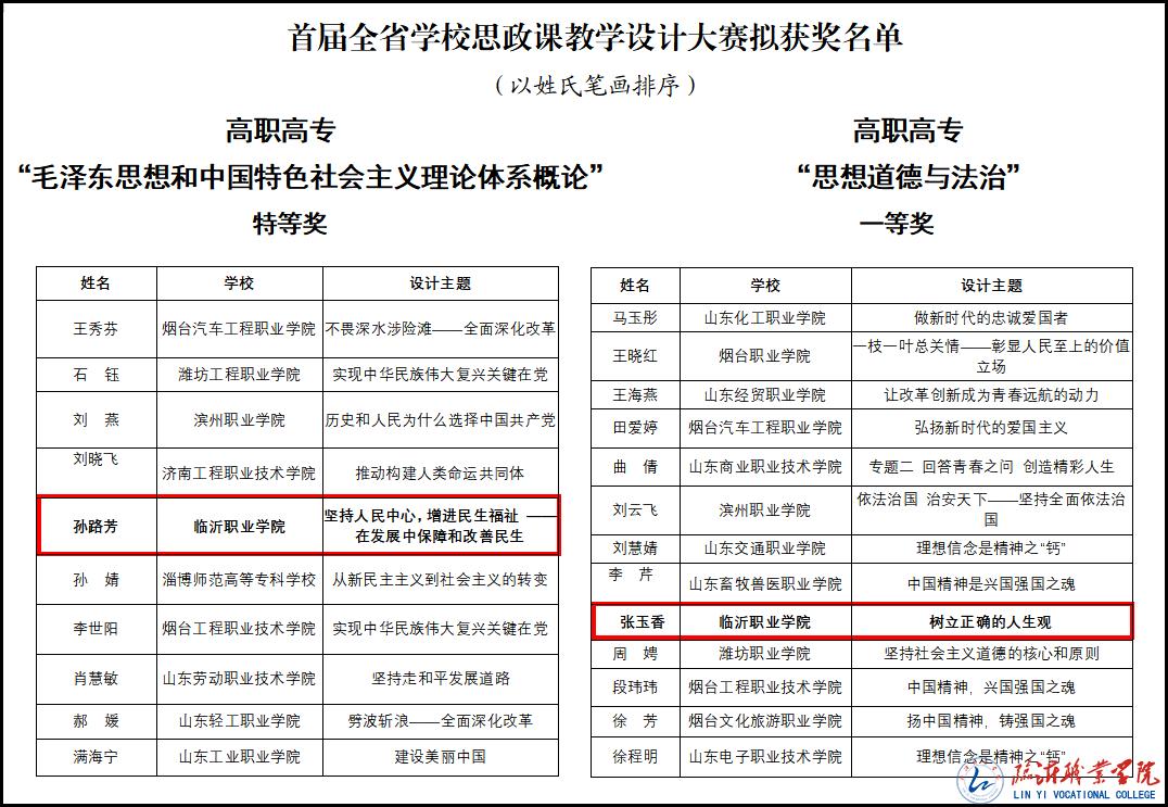 12月31日,山东省教育厅公布了首届全省学校思政课教学设计大赛评选结果,我校马克思主义学院报送的两件作品获奖。其中,孙路芳老师设计的《坚持人民中心,增进民生福祉——在发展中保障和改善民生》获得高职高专“毛泽东思想和中国特色社会主义理论体系概论”课程组特等奖,张玉香老师设计的《树立正确的人生观》获得高职高专“思想道德与法治”课程组一等奖。