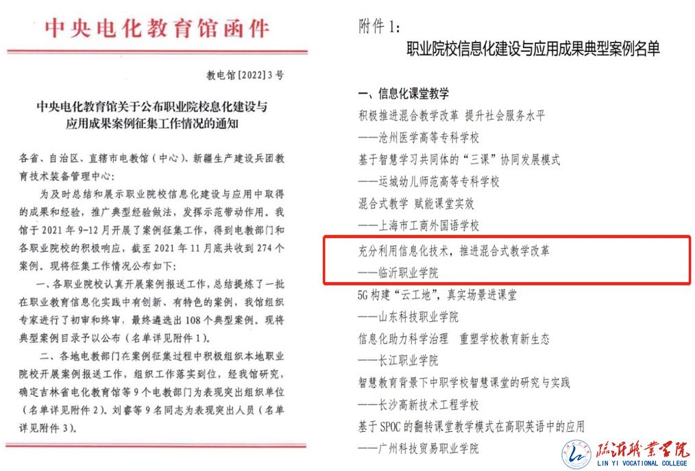 近日,中央电化教育馆公布了职业院校信息化建设与应用成果典型案例名单,我校报送的《充分利用信息化技术,推进混合教学改革》成功入选信息化课堂教学典型案例。