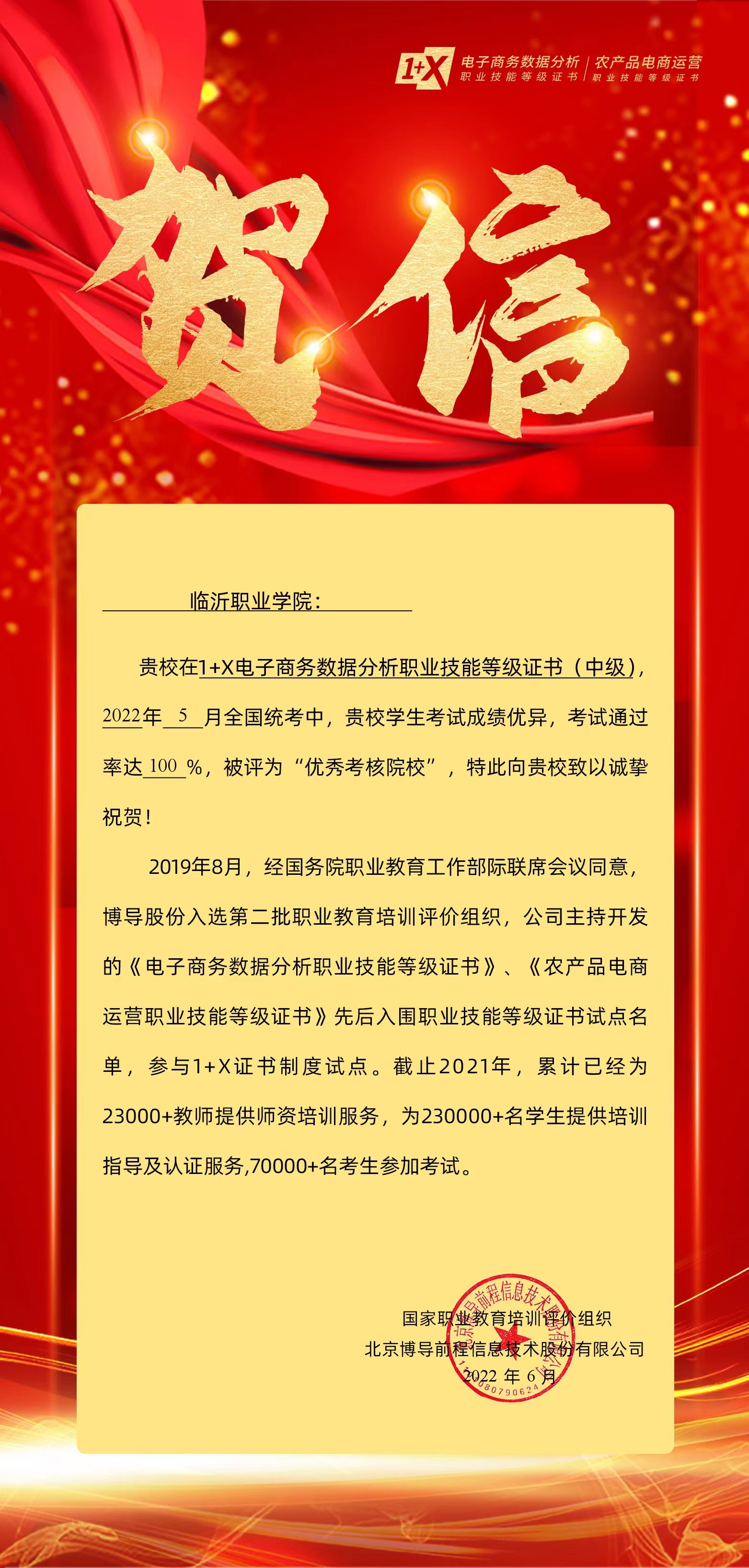 为深入贯彻《国家职业教育改革实施方案》精神,提高学生的职业技能水平,近日,学校商贸物流学院圆满完成“1+X” 电子商务数据分析职业技能等级证书考试,考试成绩优异,通过率100%,被评为“优秀考核院校”。