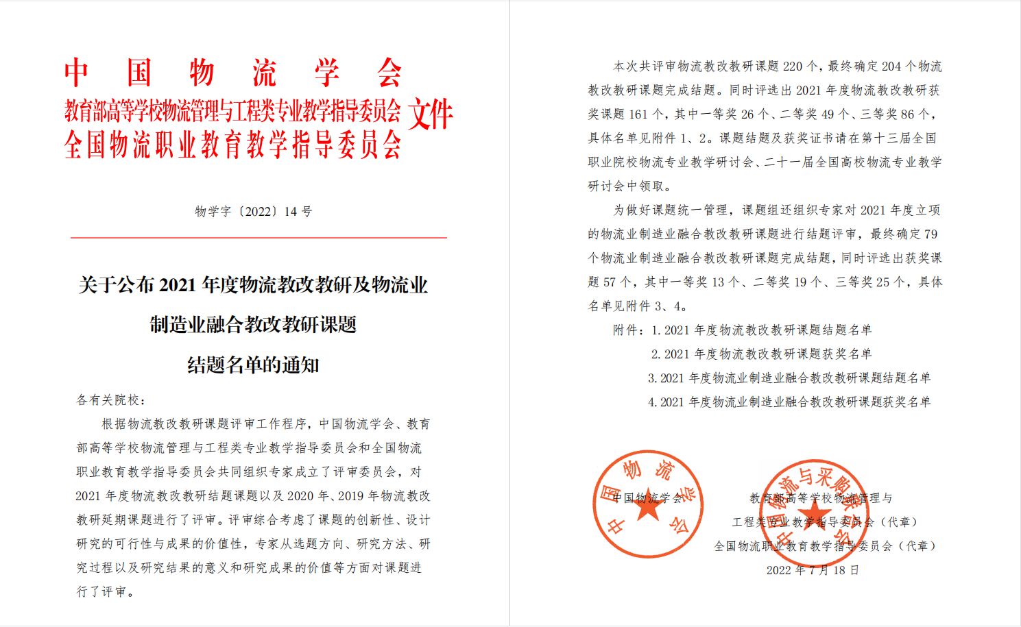 近日,中国物流学会、教育部高等学校物流管理与工程类专业教学指导委员会、全国物流职业教育教学指导委员会公布2021年度物流业制造业融合教改教研课题结题名单,我校商贸物流学院王继升老师主持的《“两业融合”背景下现代物流专业群建设路径与策略研究》顺利结题,并在课题评选中荣获二等奖。